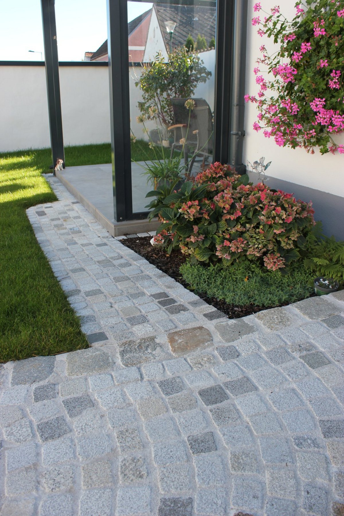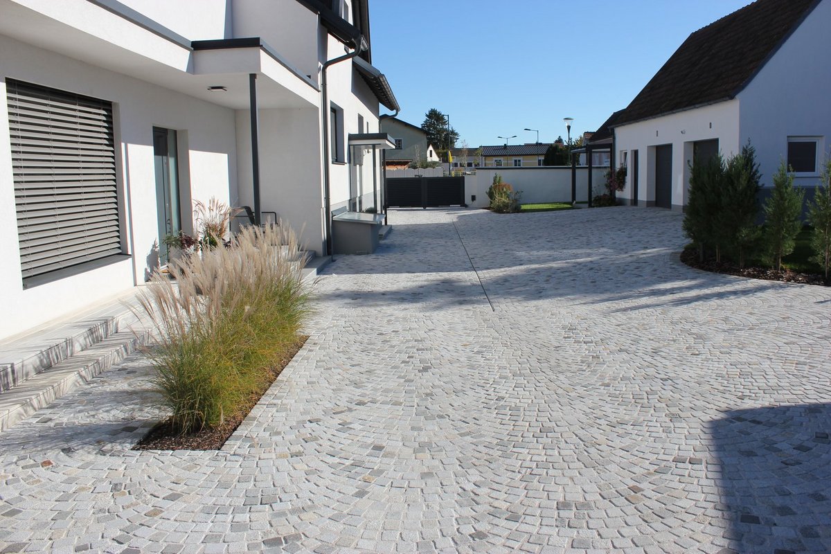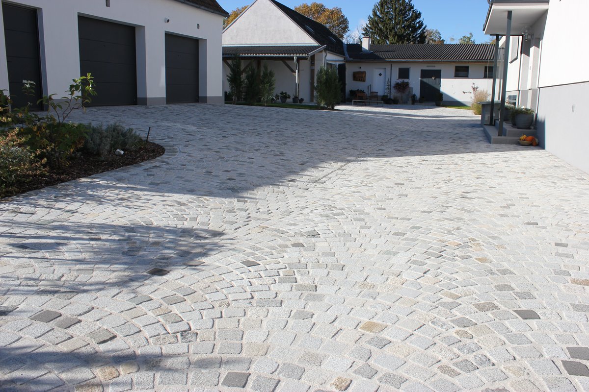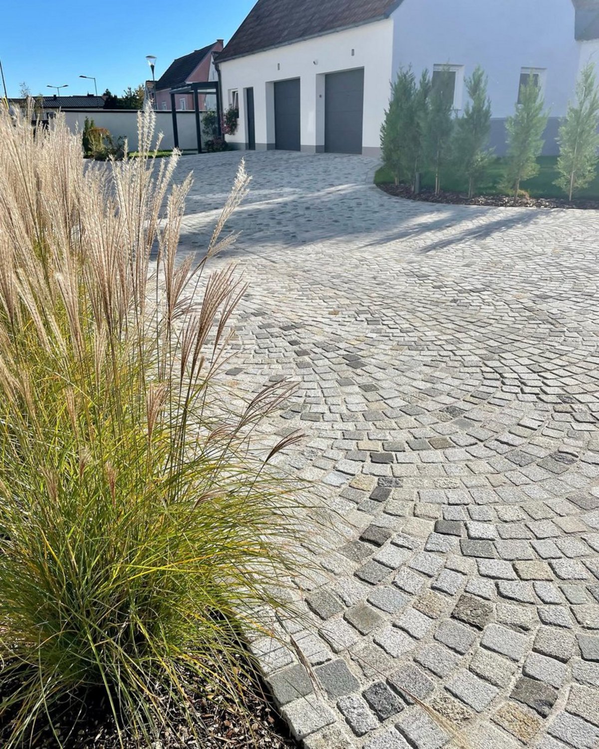 Die Einfassung wurde mit klassischen Alt-Wiener Würfeln ausgeführt, während die Flächen mit gesägten und gestrahlten Granitkleinsteinen in der Farbvariante Herbstlaub gestaltet wurden. So entstand ein elegantes und zeitloses Gesamtbild, das Funktionalität und hochwertige Optik perfekt verbindet.