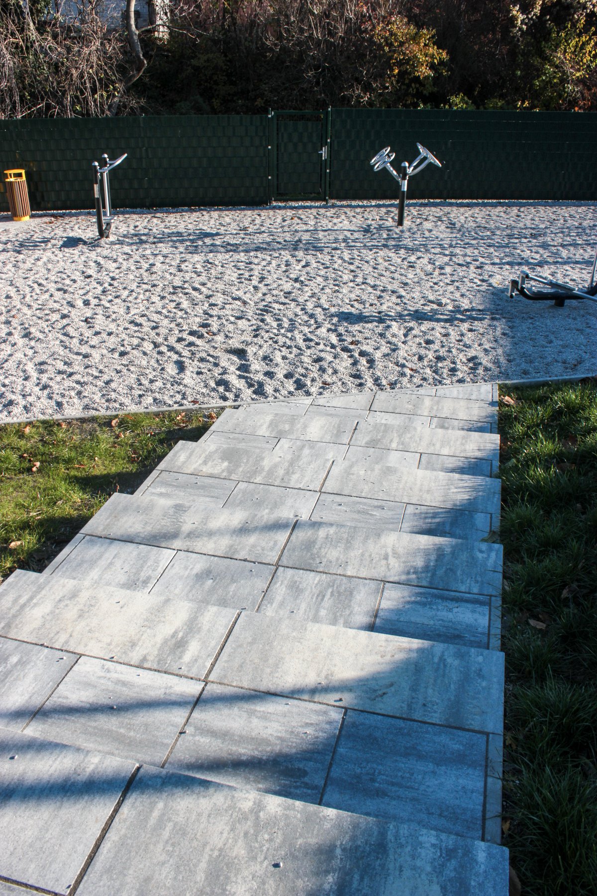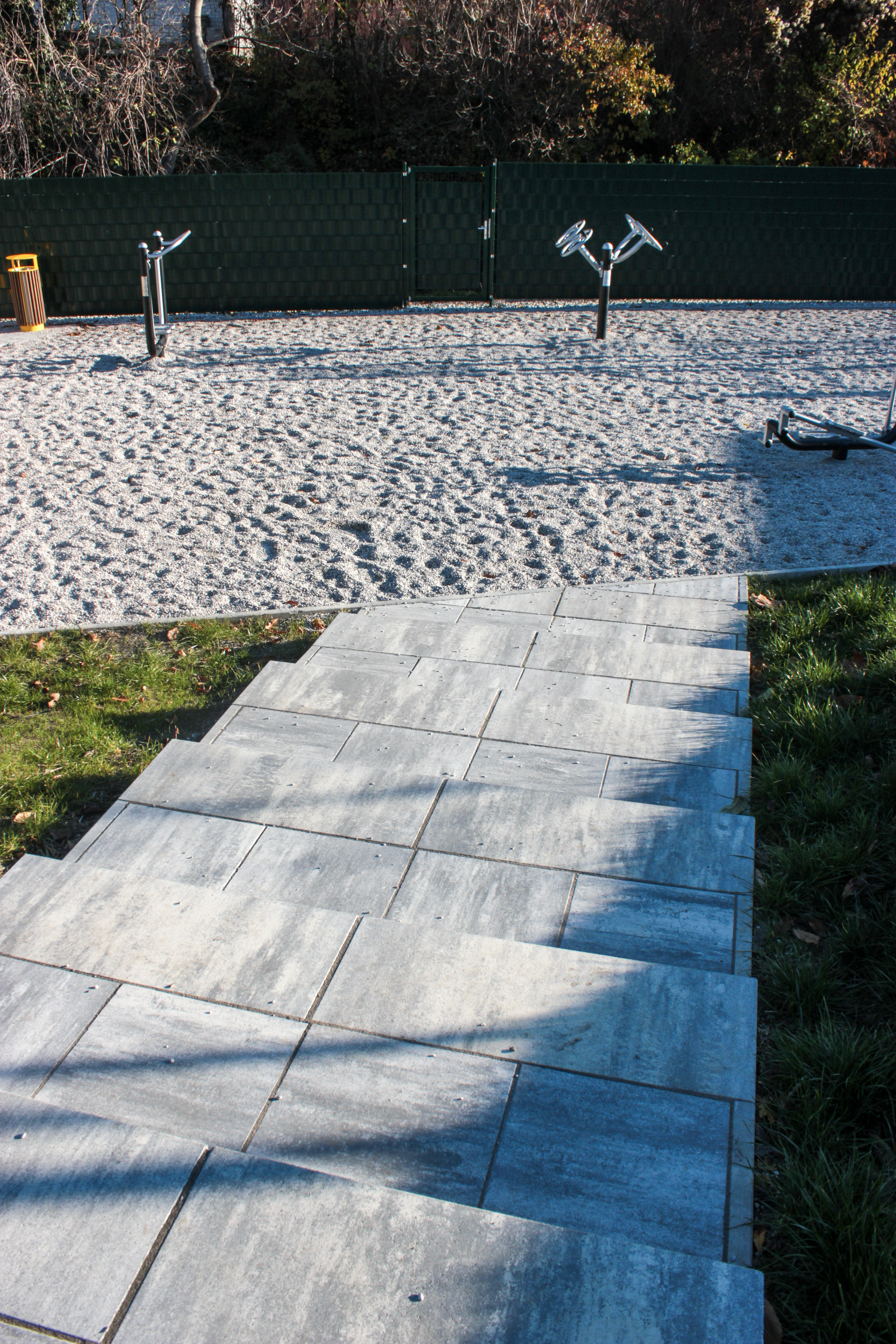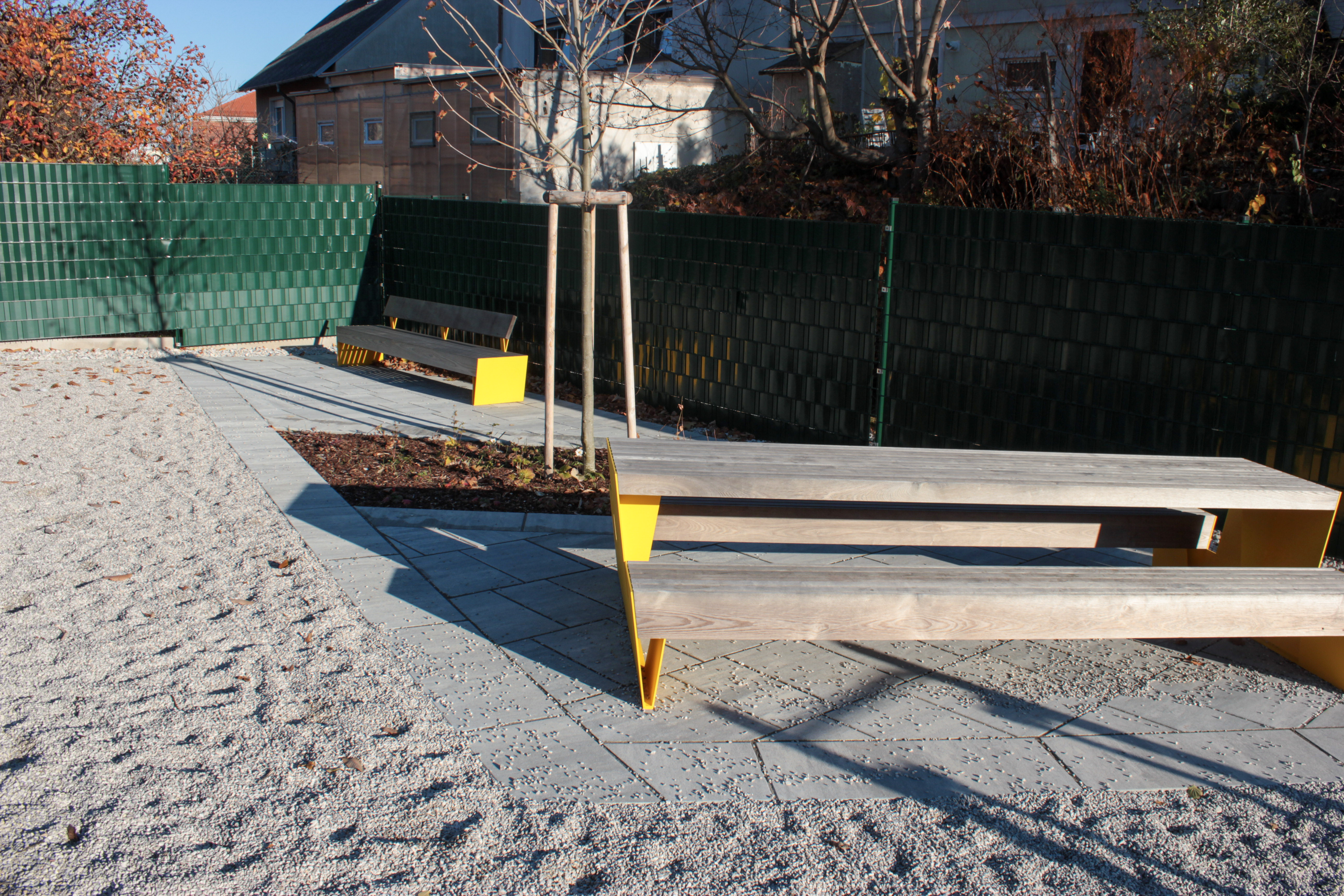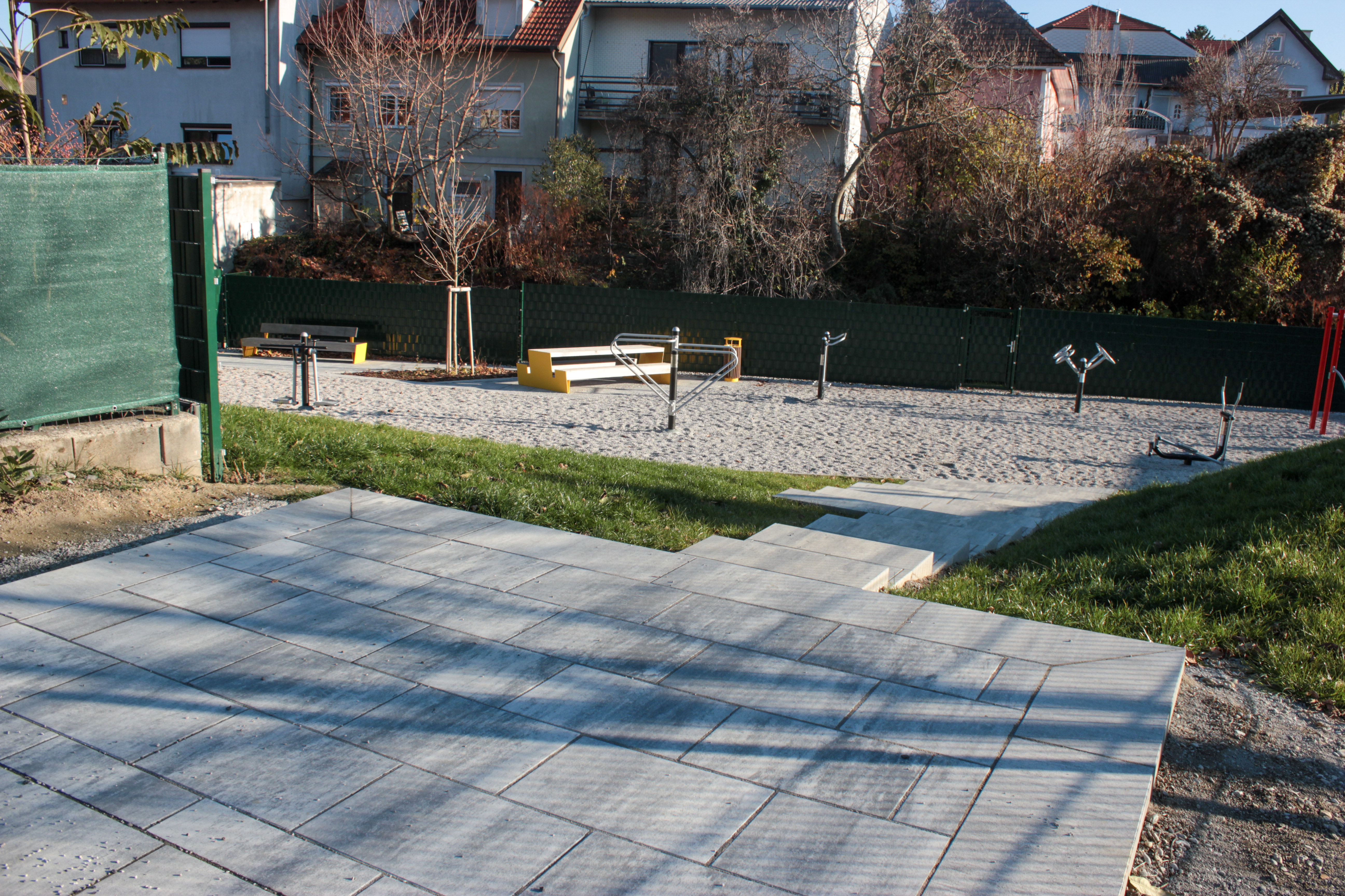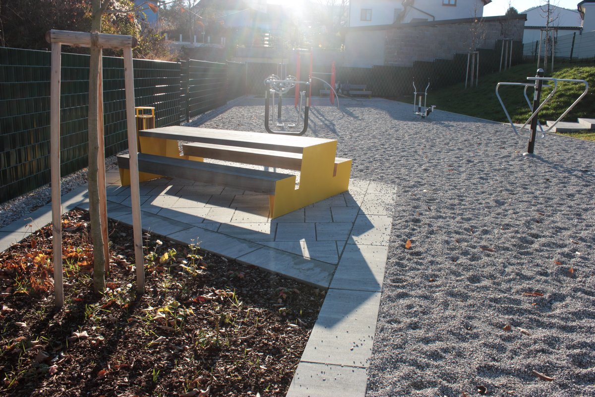 Besonderes Augenmerk lag auf der funktionalen Gestaltung: Eine neue Stiegenanlage sorgt für eine komfortable Erreichbarkeit, während Plätze und Einfassungen klar strukturierte Bereiche schaffen. Als Bodenbelag wurde Fallschutzkies eingesetzt, der nicht nur Sicherheit gewährleistet, sondern sich auch harmonisch ins Gesamtbild einfügt.