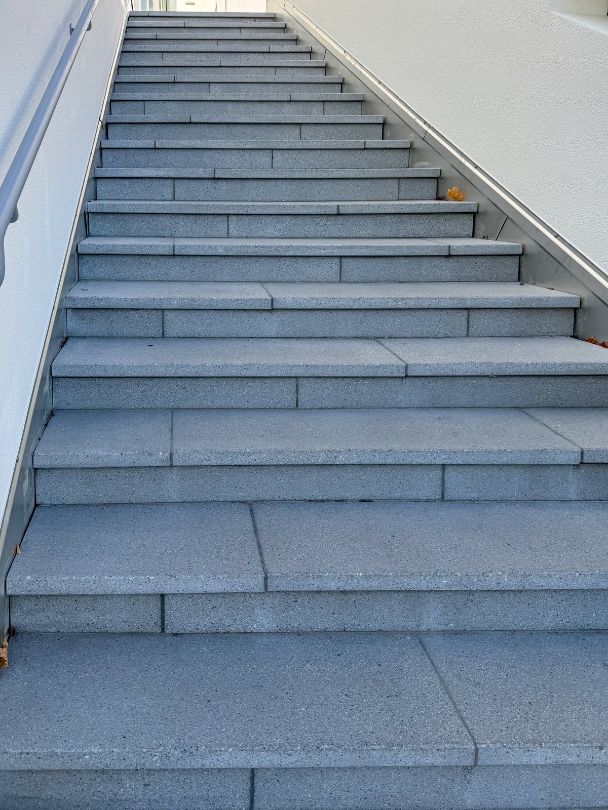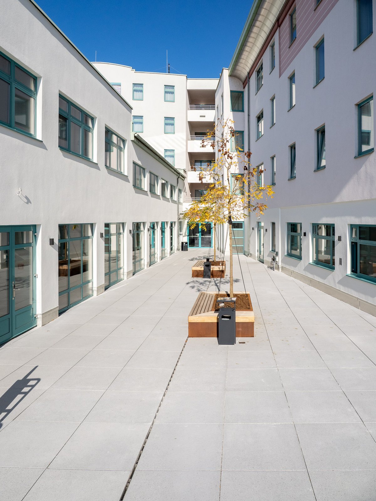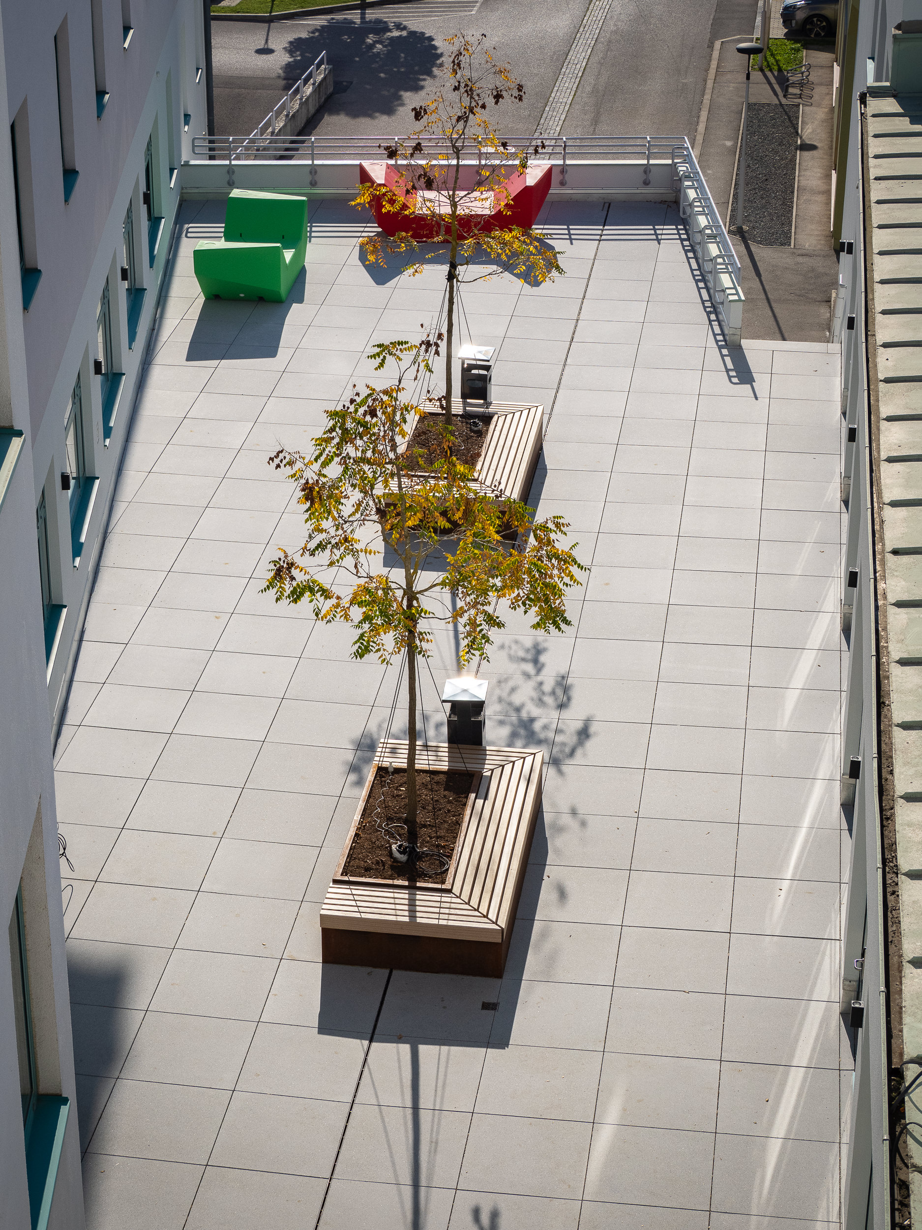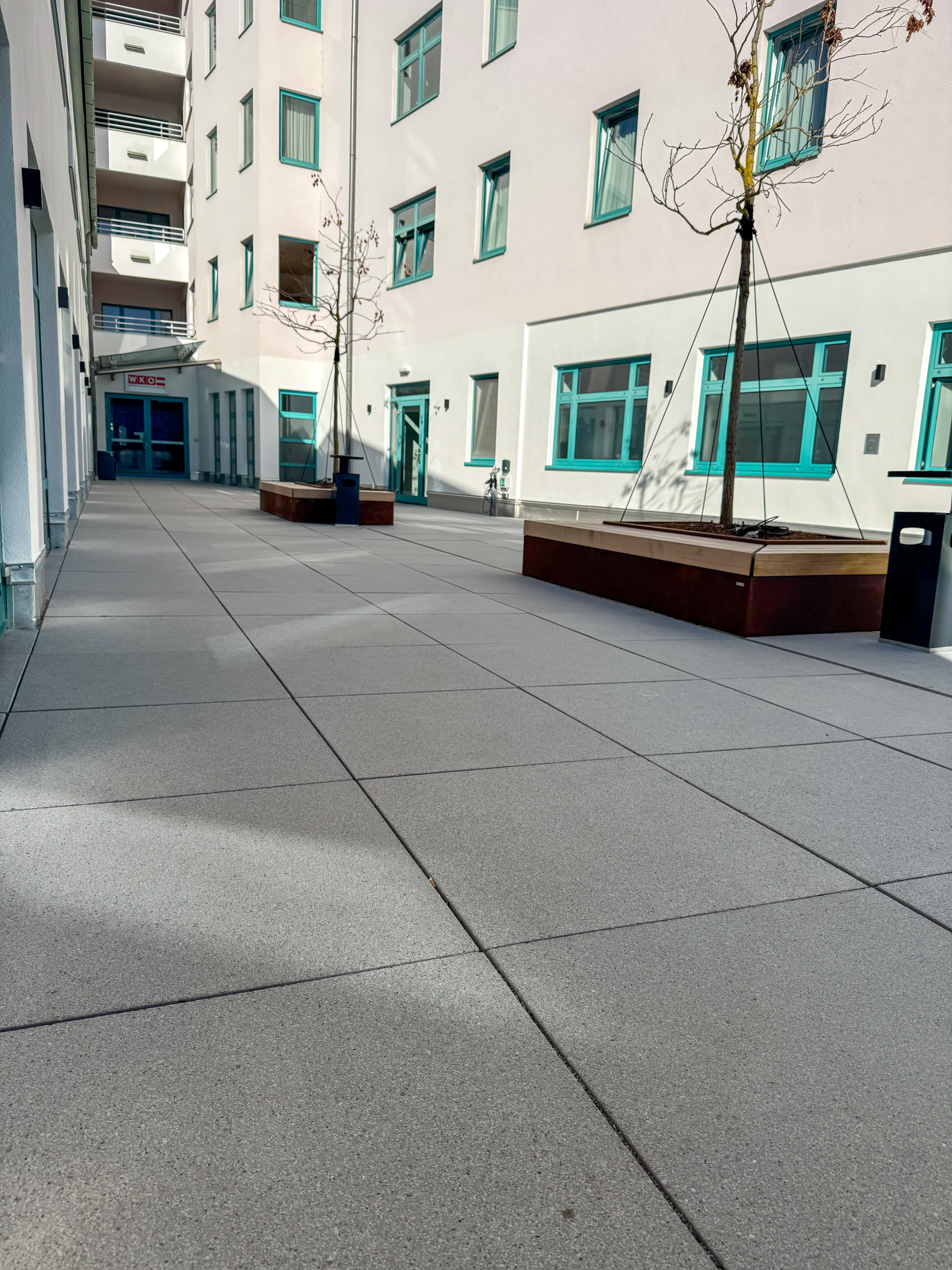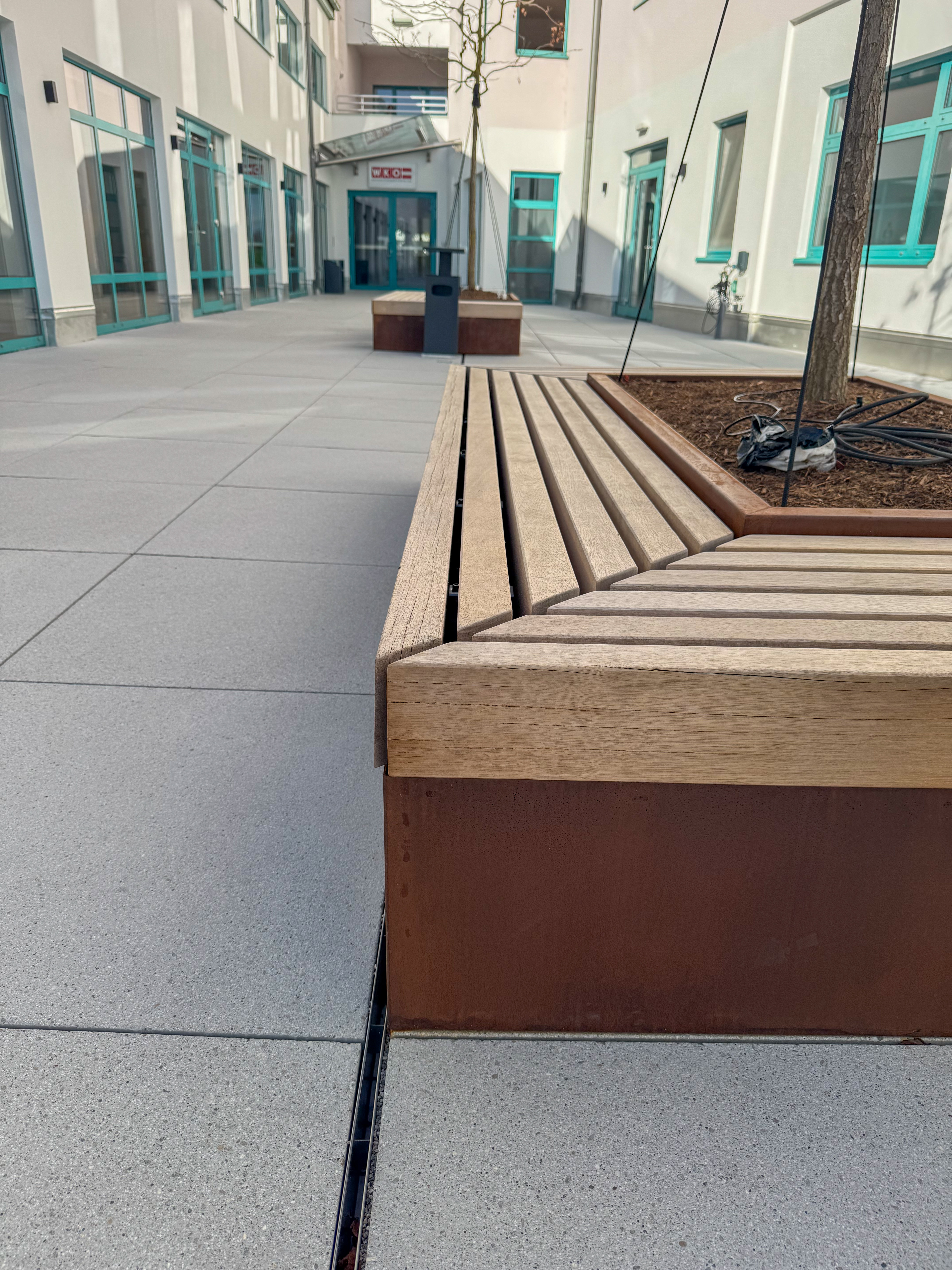 Die neuen Flächen wurden mit großformatigen Platten DOTS 90 × 90 der Firma Friedl Steinwerke ausgeführt. Ergänzend wurde eine hochwertige Entwässerungsrinne aus Edelstahl integriert, um eine zuverlässige Ableitung des Oberflächenwassers sicherzustellen. Sitzbänke aus Cortenstahl setzen gestalterische Akzente und laden zum Verweilen ein.