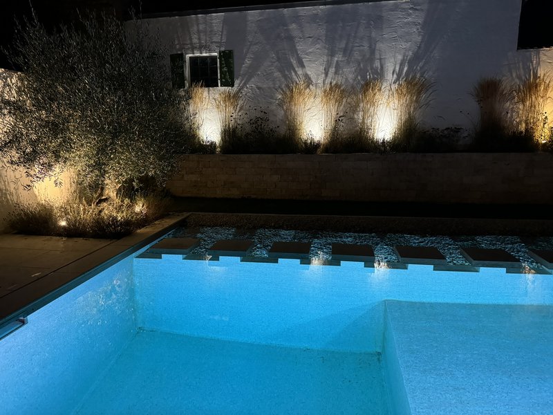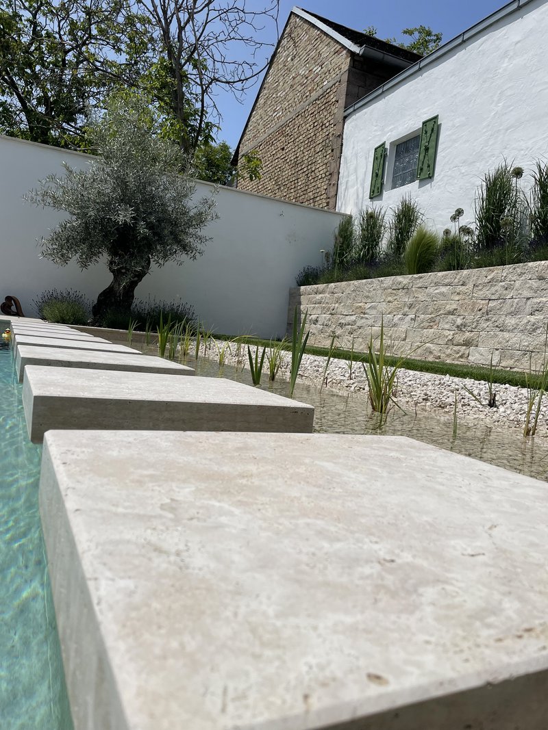 Für die Familie P haben wir den gesamten Außenbereich eines traditionellen Streckhofs revitalisiert. Herzstück des Projekts ist ein moderner Naturpool, der perfekt in die Gartengestaltung integriert wurde. Die großzügige Terrasse aus Travertinplatten und der Eingangsbereich mit massiven Travertinblockstufen verleihen dem Haus einen eleganten Rahmen. Ergänzend wurde eine hochwertige Pflasterung aus Granitkleinstein samt stabilem Unterbau umgesetzt sowie eine moderne Begrünung mit Rollrasen, Pflanzen und einer automatischen Bewässerungsanlage realisiert. Eine Pflanzbeetmauer aus Travertinstein rundet das harmonische Gesamtbild ab.