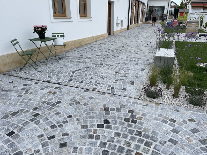 - Pflasterung mit Granitkleinstein 8/10, gesägt und gestrahlt