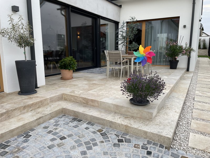 - Terrasse mit Travertinplatten
